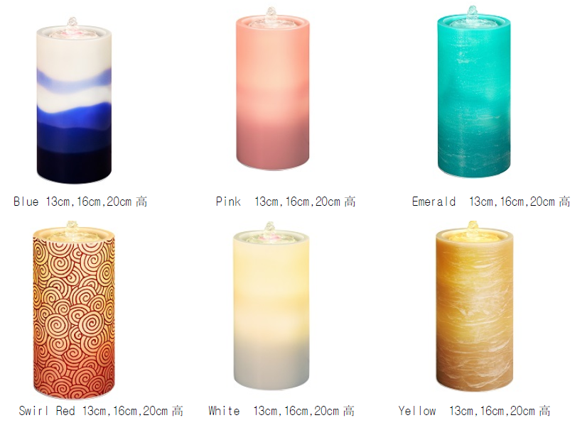 通常のピラーキャンドルの内部に水を流し、水にLEDの光を反射させて魅力的な光空間を演出する「ウォーターキャンドル」です。 3サイズ、S(USB充電),M(USB充電),L(電池/アダプター可)、全6色(ロウ)5色(モザイク)を2018年12月に販売開始。 充電式なので電池l交換の手間いらず、炎が出ないので安全です。 結婚式披露宴の演出に、各種パーティー、また、水の音を生かしてヒーリングサロン、歯科医院、病院ロビーなどに、ギフトにも最適です!!